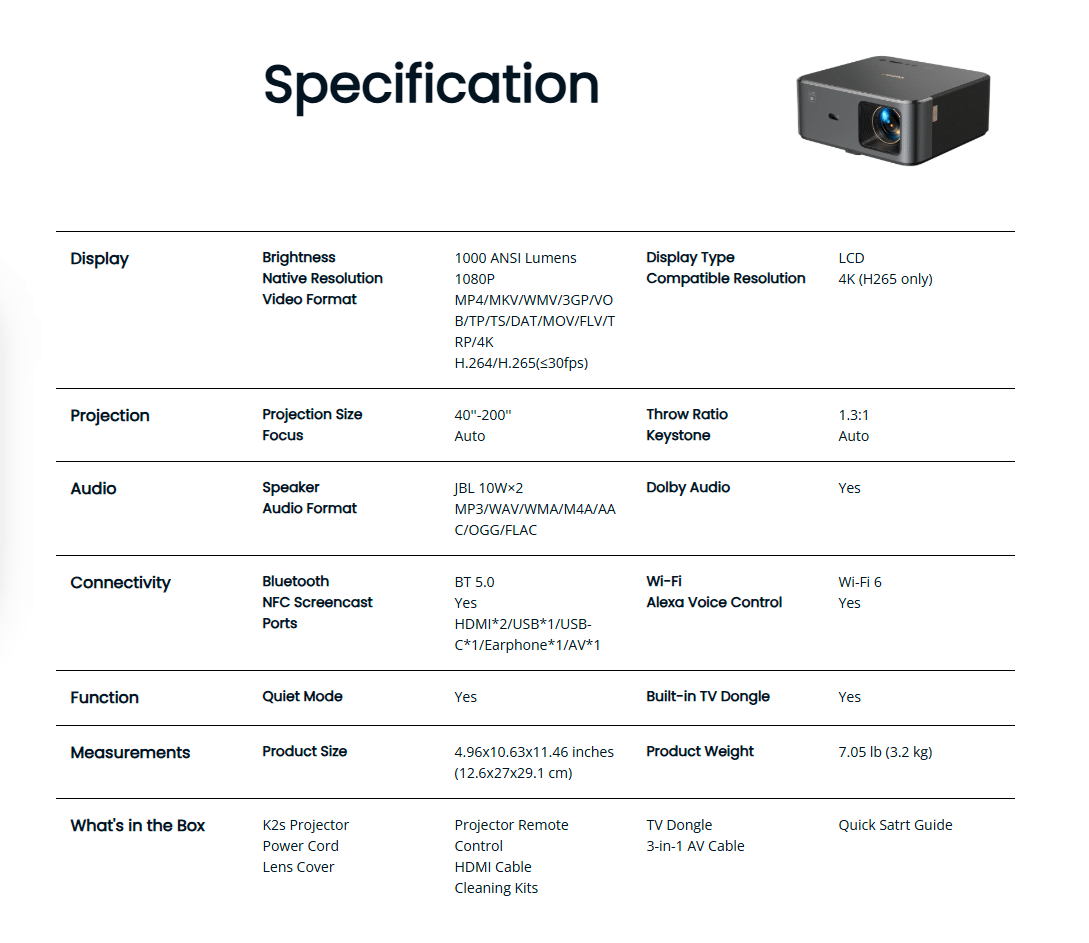 K2s leverer høj billedkvalitet i 1080p, 1.000 ANSI lumens og fyldig JBL-lyd. Projektoren understøtter Wi-Fi 6, Alexa stemmestyring og leveres med TV-dongle.Med Wi‑Fi 6, Alexa-stemmestyring og en TV-dongle til problemfri streaming tilpasser K2s sig let både til hjemmet og til arbejde. Ekstra funktioner som Quiet Mode og Ambient Mode forstærker yderligere den samlede brugeroplevelse. K2s er nu tilgængelig hos Proshop.dk, Coolshop.dk og Mobilcovers.dk til den vejledende pris på 4.199 DKK.
