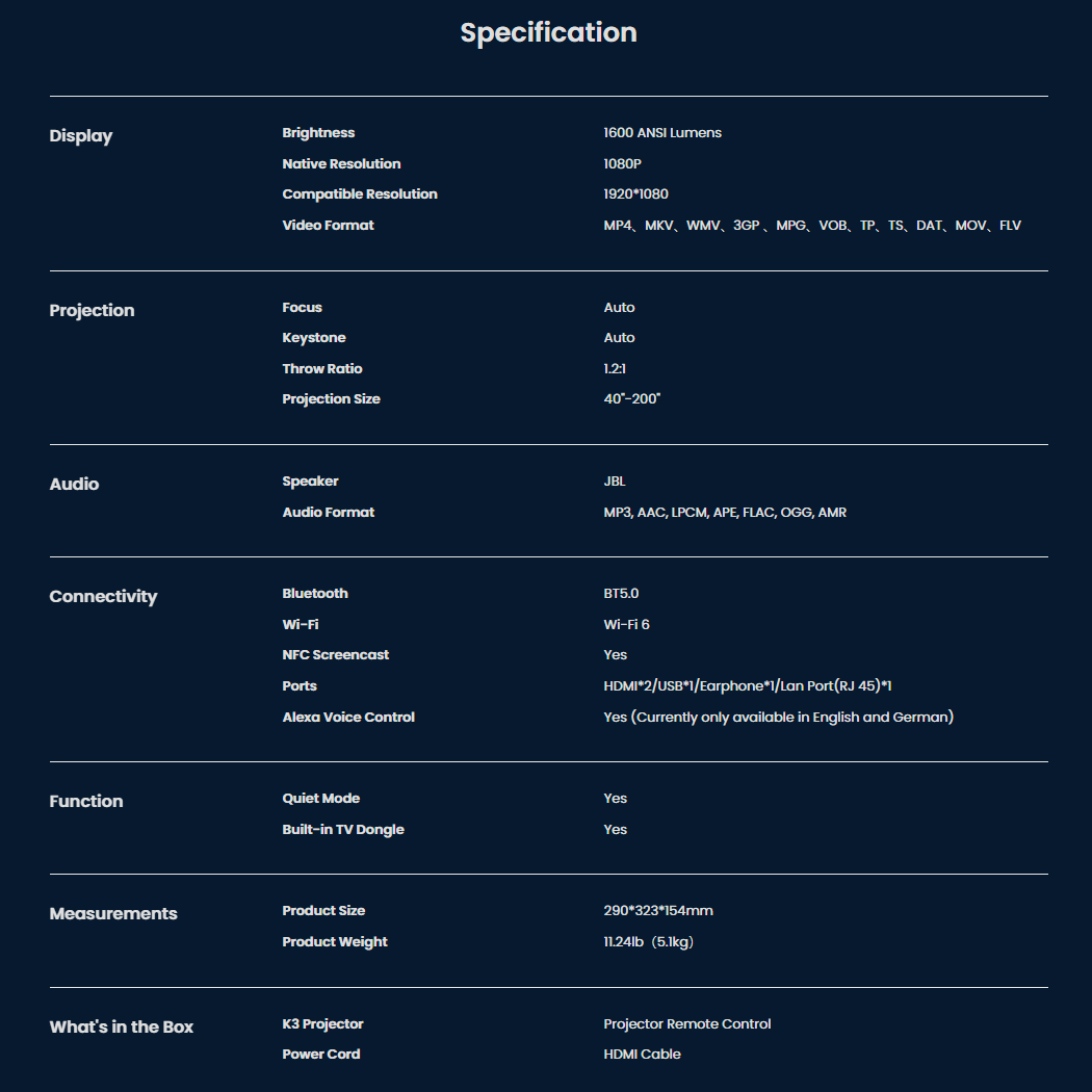 Skabt til filmelskere med sans for detaljer. K3 Pro kombinerer 1080p opløsning med 1.600 ANSI lumens og kraftig JBL lyd med Dolby Audio. Den dedikerede subwoofer i Pro modellen giver ekstra dybde og nærvær. NovaGlow™ sørger for klare billeder, mens CoolSwift™ holder enheden kølig og stille. Autofokus, automatisk skærmjustering og Google TV med over 7.000 apps gør opsætningen enkel og brugervenlig. K3 Pro er nu tilgængelig hos Proshop.dk, Coolshop.dk og Mobilcovers.dk til den vejledende pris på 5.999 DKK.